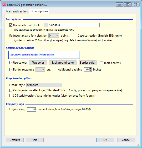Another check box is now available on the SDS generation options dialog, “Other options” tab, for Table accents. If you select this option, and have chosen a border color, then SDS sections which you have selected to be in table format will use the border color for table lines, column header text, and (where applicable) footnote text.