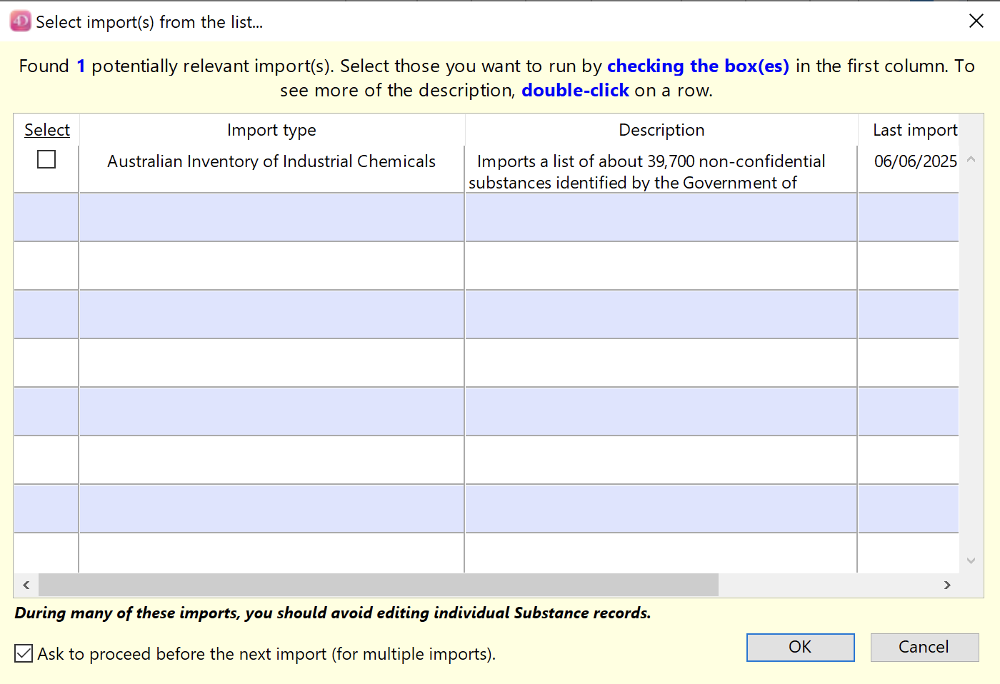 Australian Inventory of Industrial Chemicals. A new import is available, from Jan. 9, 2026. The program will offer to import at start-up, but you can import at other times by navigating File (menu) -> Imports-exports and utilities -> Review imports (button).
