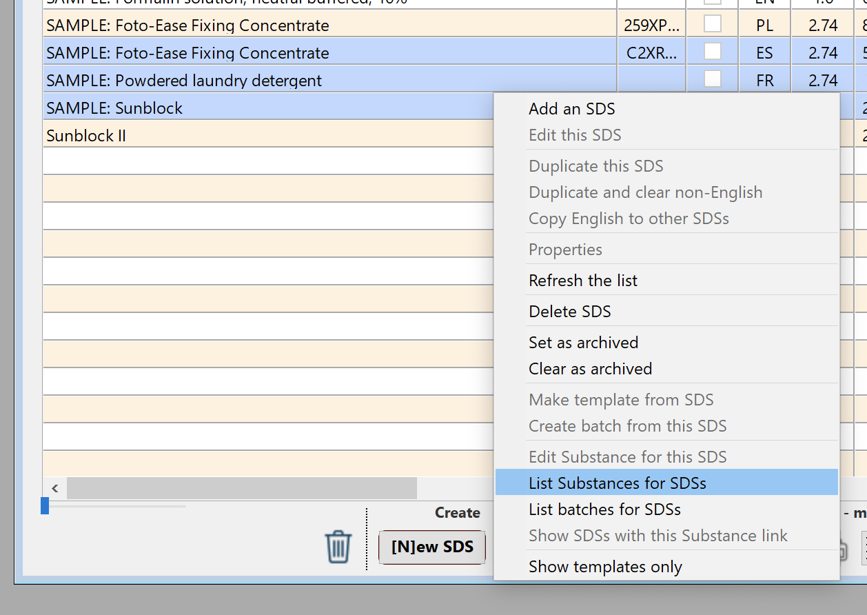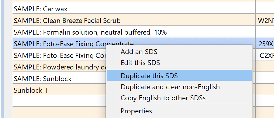 Certain items in the SDS browse list right-click (contextual) menu will now be disabled if more than one row is highlighted (e.g., “Duplicate this SDS”).