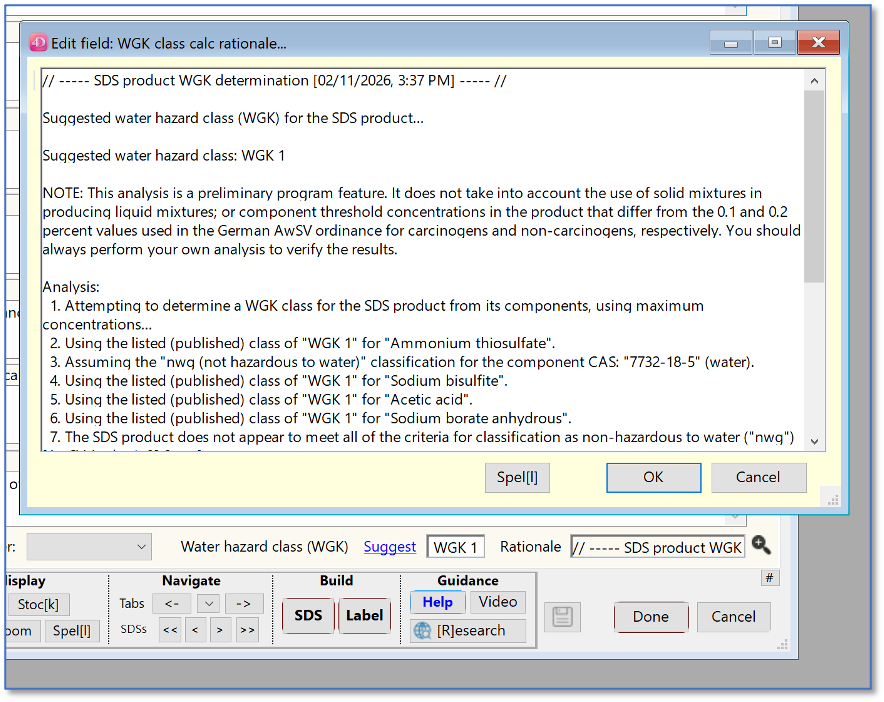SDS entry form, Water hazard class (WGK) rationale (SDS “12 Ecological” tab, “Suggest” link). Previously the program generated the rationale for the WGK designation in styled text, which the dialog was not capable of displaying properly. The program now generates the rationale in plain text. For previous entries in styled text, a box can be checked for conversion to plain text.