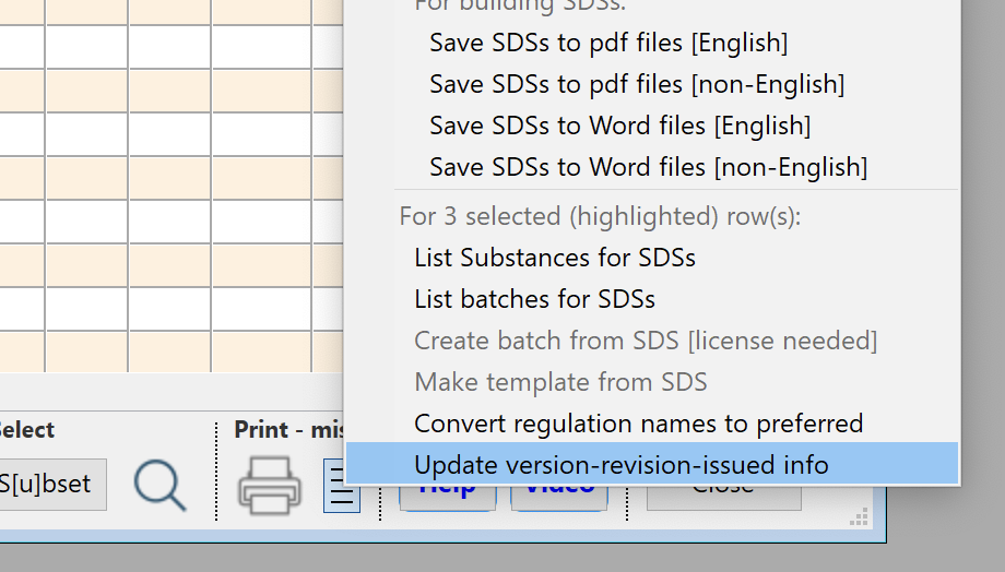 Selecting “Update version-revision-issued info” from the “Misc” drop-down, for one or more SDSs listed in the browse window.